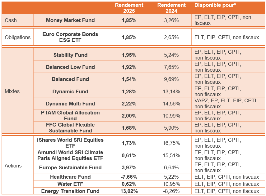 - Vous trouverez plus d’informations concernant les fonds sur notre page consacrée aux fonds de placement. Les factsheets sont mises à jour chaque mois.